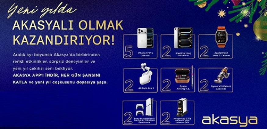 Kampanya tarihleri 02.12.2025 - 31.12.2025 arasında Türkiye genelinde, Akiş Gayrimenkul Yatırım Ortaklığı A.Ş.’ye ait Akasya AVM mobil uygulamasını iOs ve Android sistemli cihazlarına ücretsiz olarak indirerek ad-soyad-ilçe/il-gsm no, e-mail-doğum tarihi ve cinsiyet bilgileri ile birlikte üye olarak “katıl” butonunu tıklayanlara 1(bir) çekiliş hakkı verilecektir.