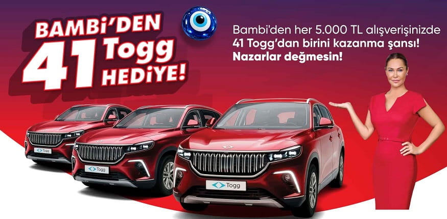 Bambi Togg Çekilişi 22.10.2026 tarihinde saat 11.00’da U2 Tanıtım ve Promosyon Hizmetleri Tic.Ltd.Şti. Sütlüce Mah. Bayrak Sok. No:4-A Beyoğlu-İstanbul adresinde, noter huzurunda ve isteyen herkesin katılımına açık olarak gerçekleştirilecektir.
