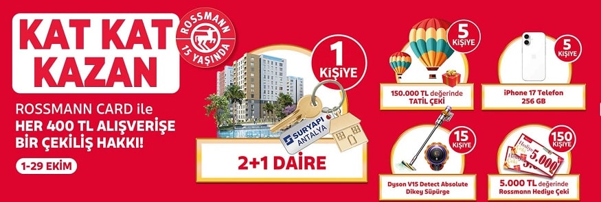 Kampanya tarihleri 01.10.2025 - 29.10.2025 arasında Türkiye genelindeki tüm Rossmann Mağazalarından, Rossmann mobil uygulamasından veya rossmann.com.tr (ücretsiz) internet sitesinden (tütün ürünleri kategorilerindeki ürünler kampanyaya dahil değildir) tek seferde 400 TL ve katları tutarında alışveriş yapan (her 400 TL’lik alışveriş için 1 çekiliş hakkı), Rossmann Card sahibi üyeler gerçekleştirdikleri her 400 TL lik alışveriş için 1 çekiliş hakkı verilecektir.